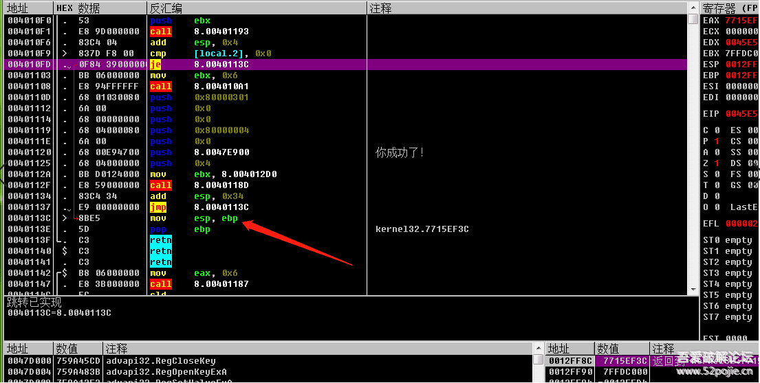 第二个是JNZ、JMP指令,他们叫做跳转指令,我们以前说过,程序不是按顺序一行一行往下执行的,会根据条件跳到不同的代码位置,跳转指令就是让代码能够跳来跳去的指令。跳转指令分为两种,一种是JMP,是无条件跳转,意思就是当代码执行到JMP语句,是无条件执行跳转的,跳到哪?就是跳到JMP后面的代码地址。另外一种是JZ、JNZ等,是有条件跳转,意思就是当代码执行到JZ、JNZ时,跳还是不跳要根据上面代码得到的结果来判断,我们可以联系一下以前的知识,我们先定位验证后的结果代码位置,然后反查看上面代码是否有一个跳转可以跳过关键字符串,然后就可以向上定位关键验证位置,所以,JZ、JNZ这些条件跳转指令是我们破解的关键点,所以我们在破解时最需要留意的就是看这些条件跳转,一般而言,如果在关键代码处附近出现一个大的有条件跳转指令就很可疑。最常见的就是这样的,JE是一个条件跳转,它跳到了一个JMP下面一行,这是典型的条件判断编程语法。