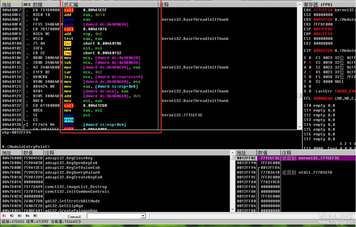 红色方框内显示的就是程序的一段汇编代码,每一行是一个语句。你刚开始肯定看不懂,然后有人告诉你,你必须先去学习汇编,然后再来学破解,结果你一去学汇编,发现枯燥难懂,你就放弃了破解,非常可惜。其实不用刻意去学汇编,我们新手刚入门,只要明白三个汇编的指令就可以了。