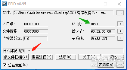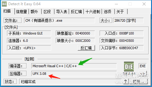 根据红绿两个箭头显示出这个软件有壳,是UPX壳。