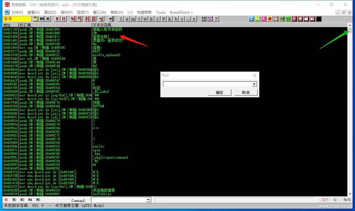 这个页面是OD显示字符串的页面,红色箭头指的是关键的提示字符串,如果你没有看到,你可以点绿色箭头指的“滑块”上下查看,如果字符串太多,通常使用的方法是在这个页面上按鼠标右键,选择FIND,就是搜索字符串的意思,快捷键是F2,然后你搜索“登陆失败”就会到这个位置。