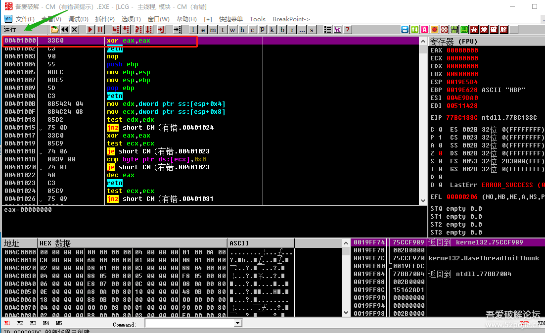 看一下红色箭头指的是CM,而且代码区是地址是小地址,所以证明我们的程序此刻停在“程序空间”,怎么判断程序是暂停状态呢?你看一下代码区的左上角是不是有一个红色的“暂停”,如果是运行状态,就会写“运行”。