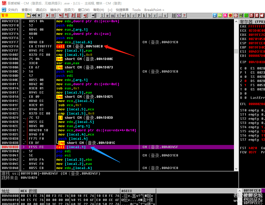 当我们看到在一个CALL的上面出现了我们的假码,如果再有一个可疑的字符串,呵呵,那么,你懂得!