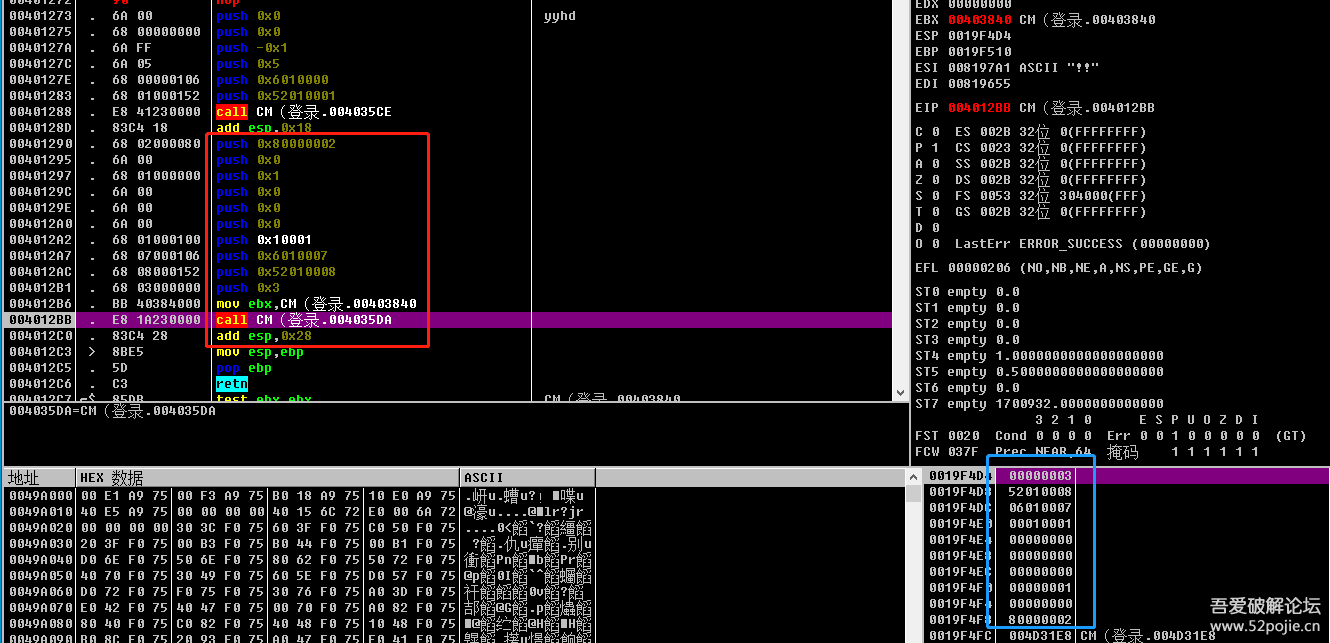 你再看一下上图右下角的堆栈窗口中的蓝色方框内,是不是在这个位置存储了PUSH 后面的数值,也就是参数。还记得我们以前说的吗?堆栈是和子程序发生联系的。