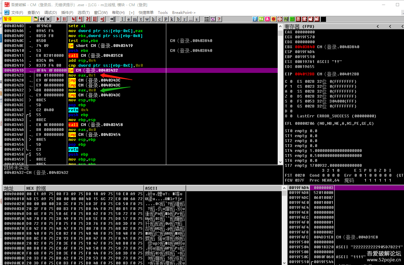 这是我们这个程序的验证CALL的尾部位置。RETN上面的红色箭头指的是不是有个MOV EAX,1,绿色箭头指的是不是有个MOV EAX,0,上面的0040341D处有一个JE跳转。