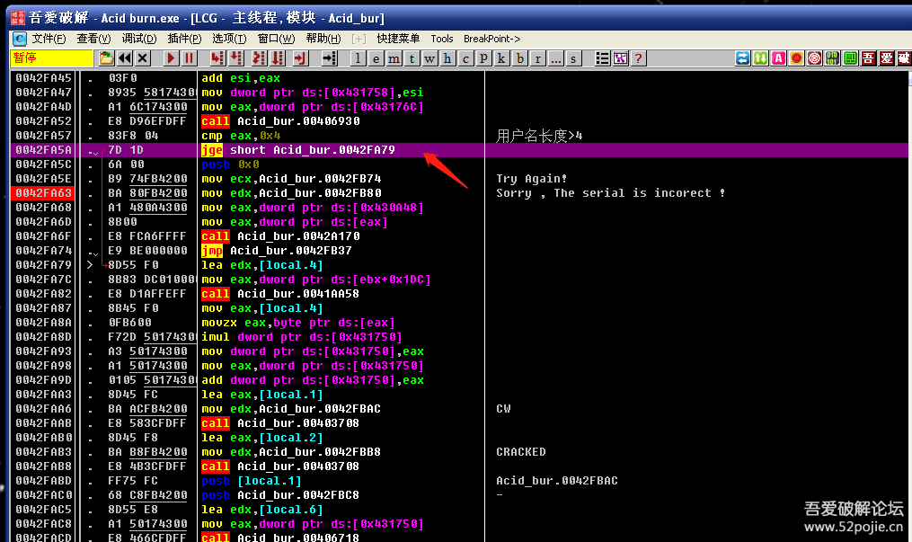 红色箭头指的00425627是关键跳,改成JMP就成功了。