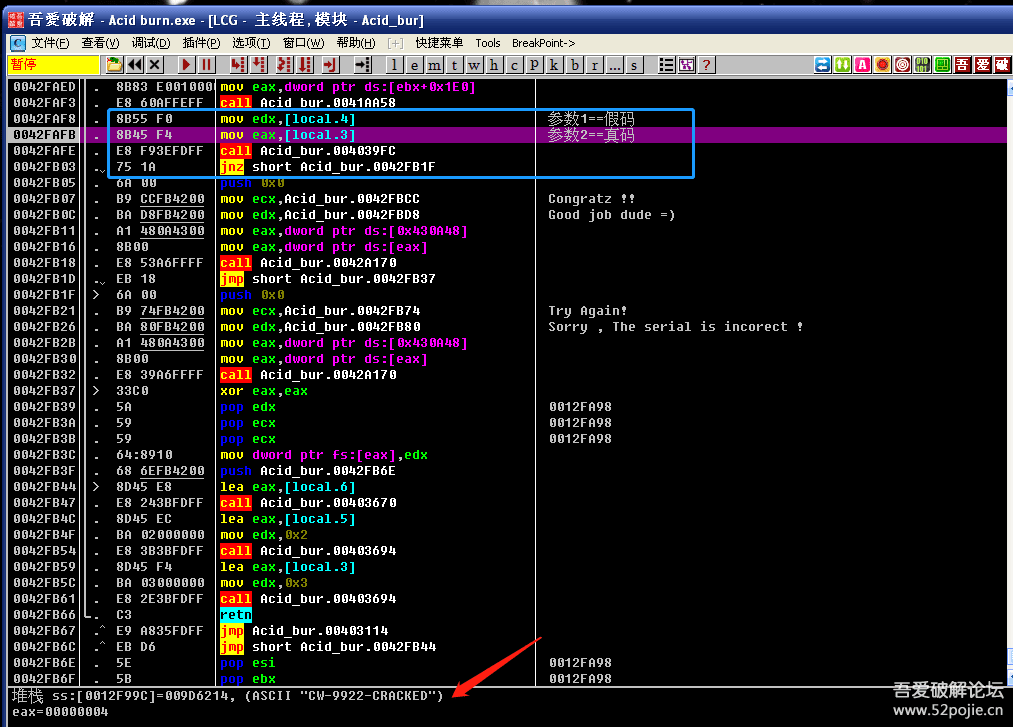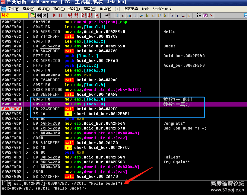蓝色方框内是关键CALL,上面是两个参数,分别是假码和真码。下面是关键跳。