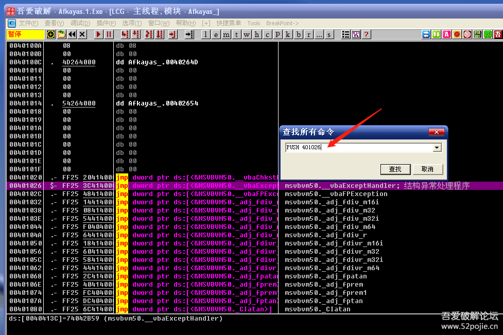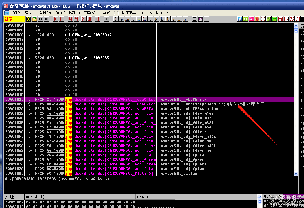 找到红色箭头指的vbaExceptHandler结构异常处理程序。看到这一行的地址是401026。
