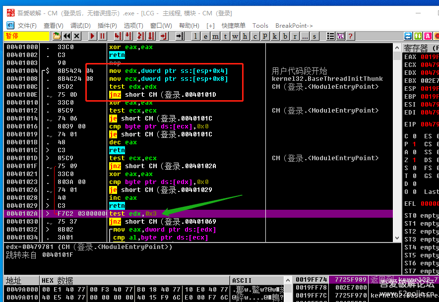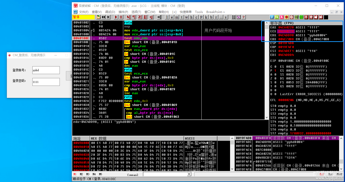 我们在test edx,edx 这一行下断点,然后输入假码,点登陆。