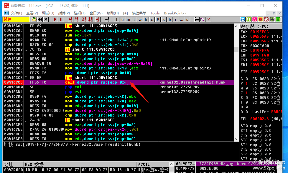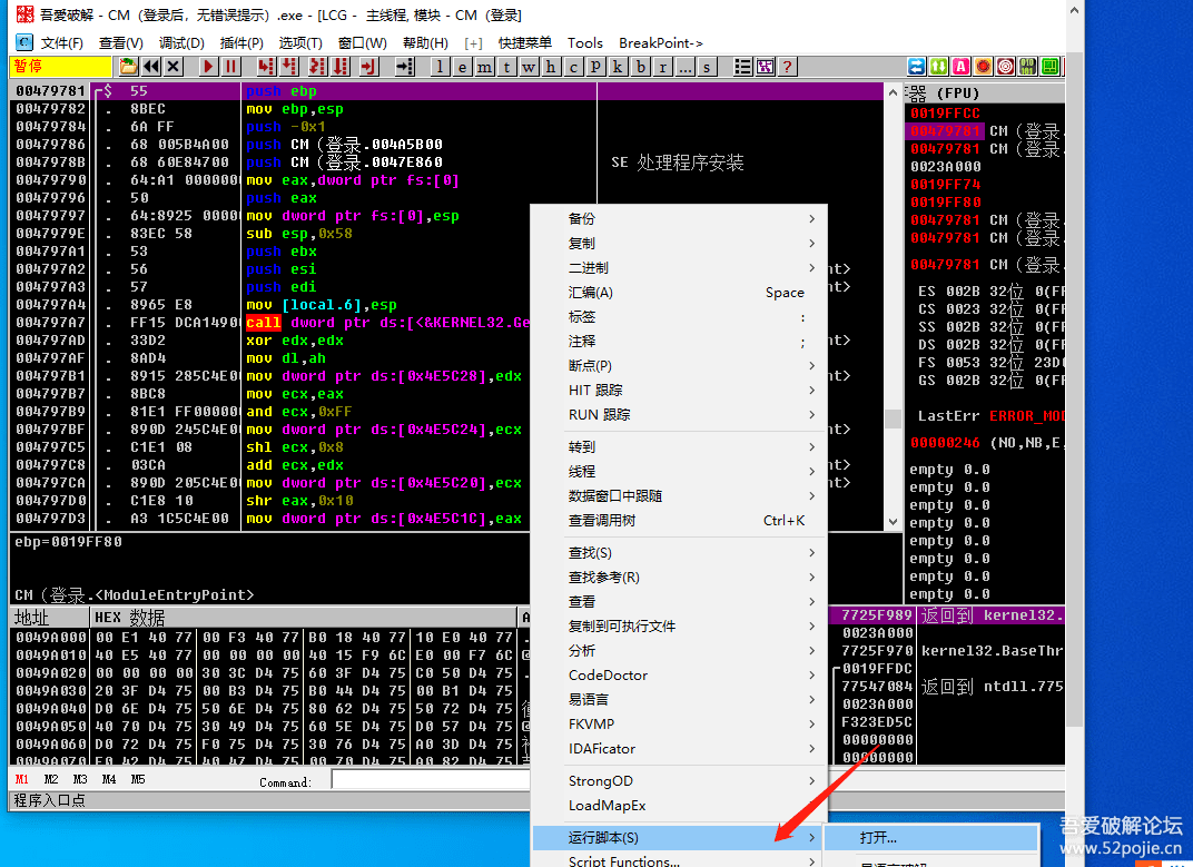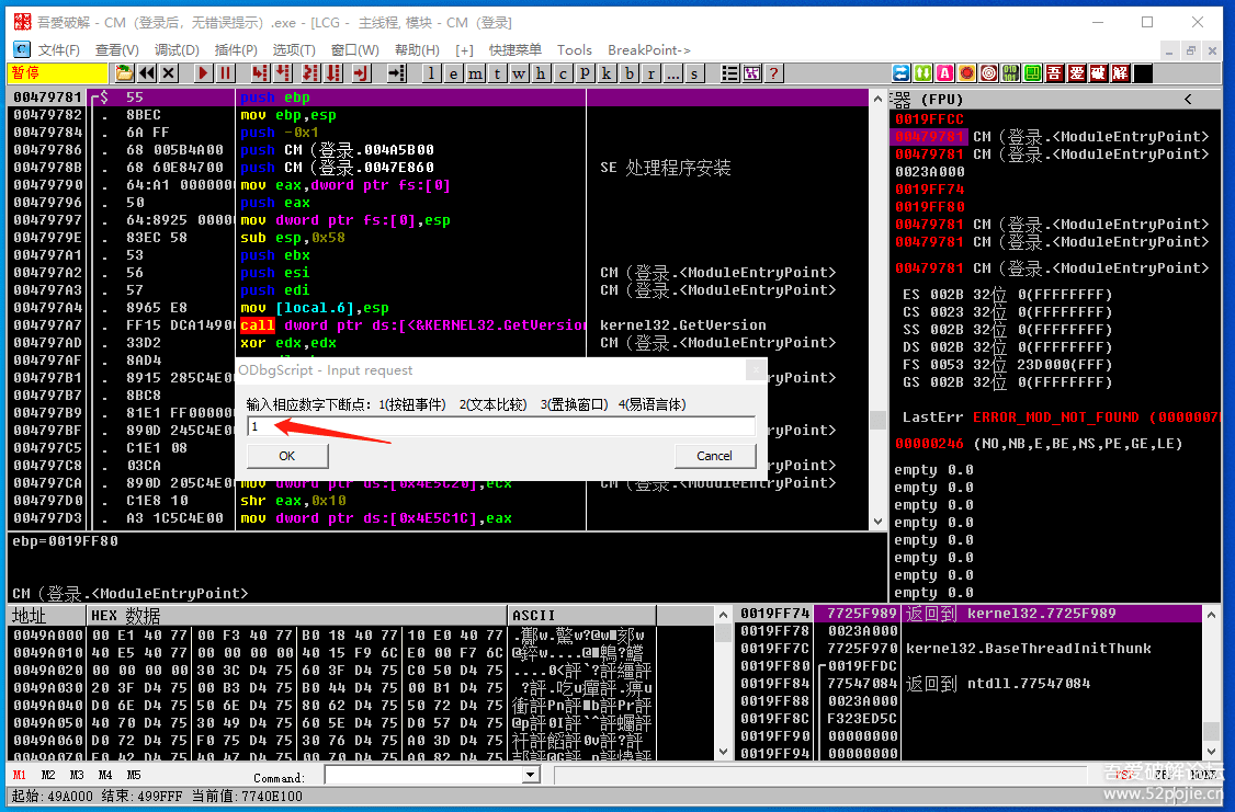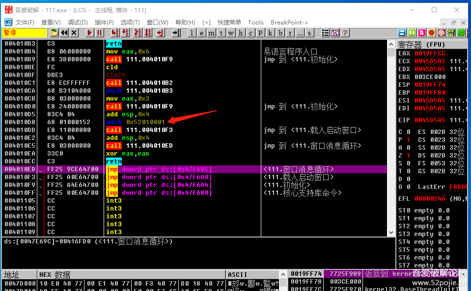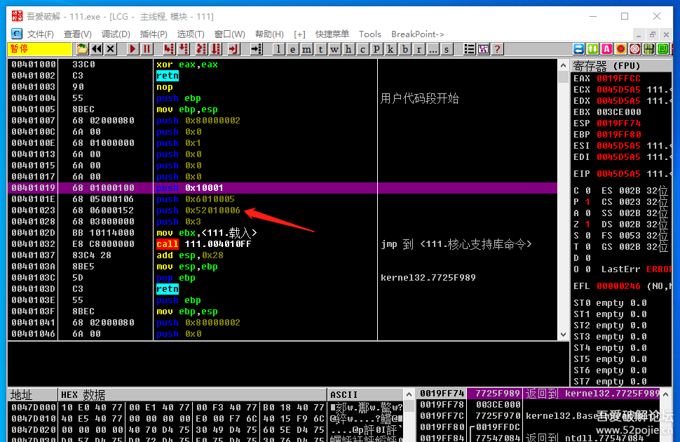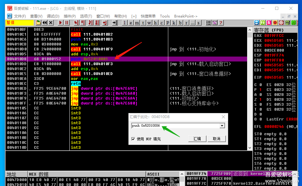 双击红色箭头指的第一个窗口的代码处,修改为PUSH 52010006即可。