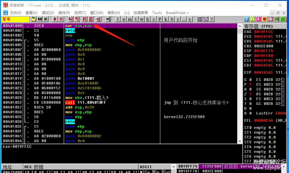 看红色箭头指的401000处的汇编代码,如果是xor eax,eax就说明是易语言编写的程序。