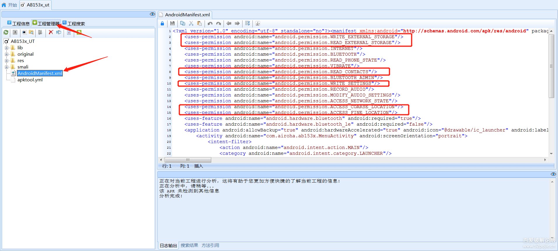 既然发现了,干掉!顺带干掉自己觉得不必要的权限。打开工程管理器,双击AndriodManifest.xml,可以看到右侧打开的文件中对应的那些权限。